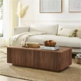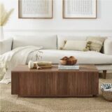 This modern coffee table delivers an understated yet striking presence, making it an effortless focal point for any space. Designed with a minimalist approach, it embraces clean lines and a streamlined silhouette while still offering subtle details that elevate its aesthetic. The mitered corners bring a sense of craftsmanship, while the sturdy plinth base adds a grounding, architectural quality. Its natural wood-look finish in antiqued satin walnut beautifully captures the warmth and richness of real wood, complemented by a ribbed base that introduces an appealing texture and visual depth. Built from high-quality MDF and PVC materials, it offers long-lasting durability without compromising on style.Simple maintenance—clean with a soft, dry cloth to keep the finish looking its best without the use of harsh chemicals or abrasive materials.